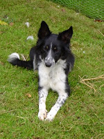 Benca, Elle est là toute confiante et souriante, Elle fait l’hélicoptère sur commande avec sa queue. Elle est heureuse, car on descend des oies, après lesquelles elle a cavalé avec Clyde en toute liberté. Car moi, je n'y connais rien. Je rouspète juste lorsqu'ils sont trop brutaux avec les volailles.